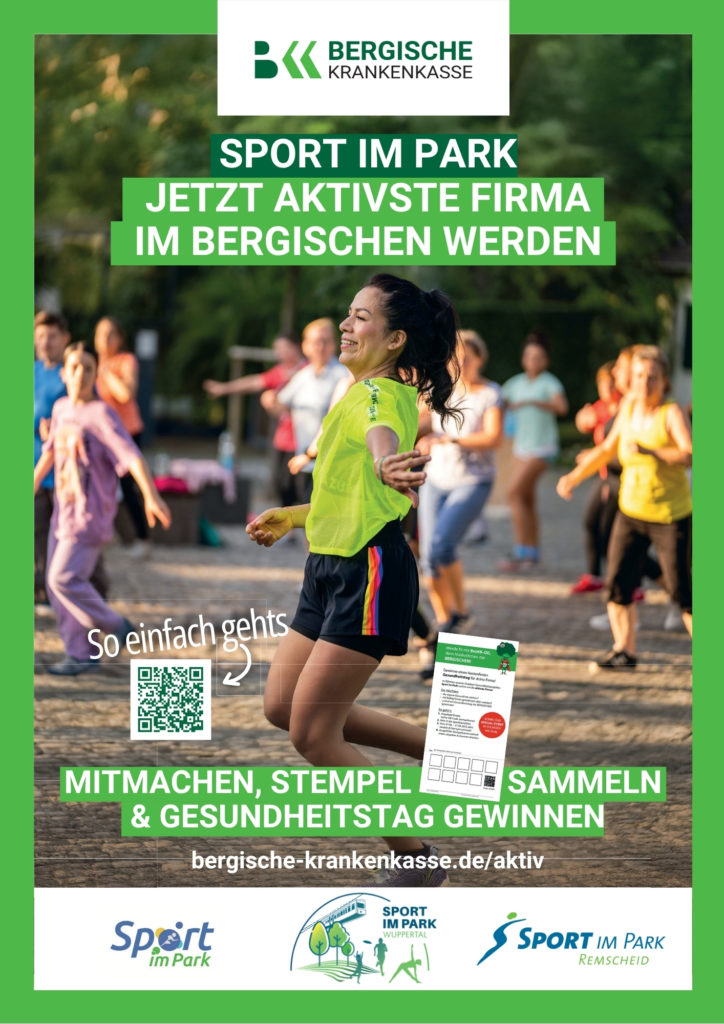 Auch dieses Jahr suchen der Sportbund Remscheid und die BERGISCHE KRANKENKASSE im Rahmen von „Sport in Park“ die aktivste Firma Remscheids. Damit soll über in Remscheid ansässige Firmen in diesem Jahr auch die arbeitende Bevölkerung besonders angesprochen und in Bewegung gebracht werden. Nach Abschluss von Sport im Park wird die aktivste Firma Remscheids von der BERGISCHEN mit einem Gesundheitstag für die Belegschaft belohnt. Interessierte Firmen finden alle Infos und die Möglichkeit zur Anmeldung auf: bergische-krankenkasse.de/aktiv